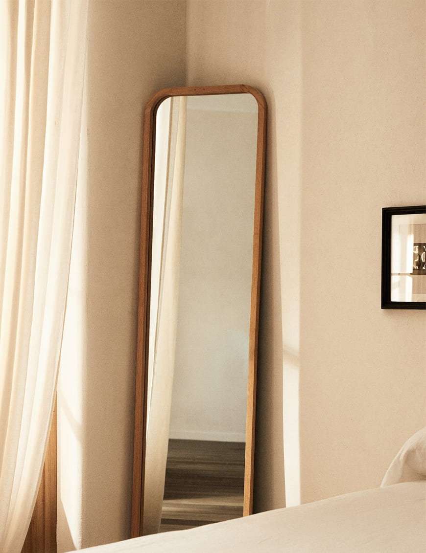 یک آینه عمودی با قاب گرد نه تنها هدف کاربردی خود را برآورده میکند، بلکه به عنوان یک عنصر تزئینی نیز عمل میکند، نور را منعکس میکند و ضمن افزودن یک عنصر طراحی متمایز به دکوراسیون اتاق، توهم جادار بودن را ایجاد میکند.